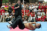9月3日,一位杭州大力士在尝试用扁担将四个"西湖美女"挑起。 当日,2006年杭州民间传统武术绝技比武活动在杭州钱王祠举行,来自全国各地的"武林人士"纷纷上台献艺,向观众展示中华武术各门派的……