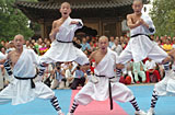 9月3日,来自浙江丽水的民间艺人李康乐表演"吸碗转体吹笛"绝技,李康乐用腹部的力量将自己吸在一只铁碗上,并吹奏笛子。 当日,杭州民间传统武术绝技交流表演在杭州钱王祠举行。 新华社发(李宁 摄) ……