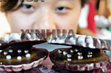 9月3日,济南一商场的工作人员在展示用巧克力制作的生肖猪。 这种巧克力创意独特、造型逼真,每克售价8角钱,虽"身价"不菲,还是吸引了不少顾客。中国图片总汇发(赵晓明 摄)
